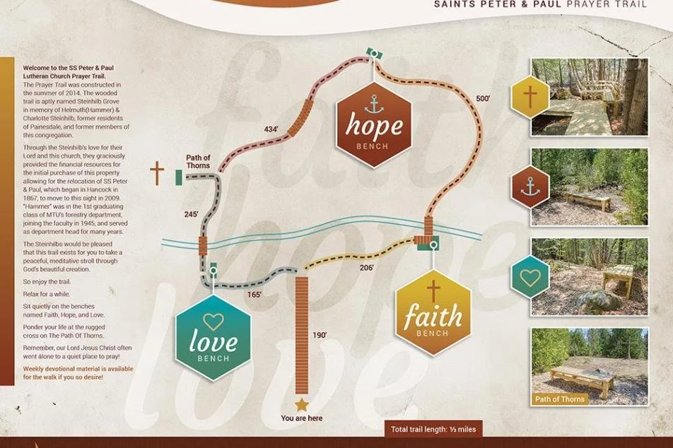 The Prayer Trail was constructed in the summer of 2014. The wooded trail is aptly named the Steinhilb Grove in memory of Helmuth (Hammer) & Charlotte Steinhilb, former residents of Painesdale, and former members of this congregation.